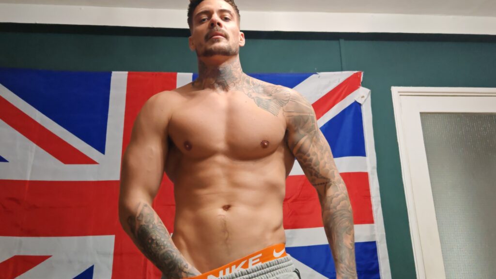 Leo’s built from real graft: broad shoulders that carry bricks all day, thick arms wrapped in heavy ink — roses, script, crowns snaking up forearms and chest, telling stories of hard nights and harder days. No pretty-boy polish — this is estate-forged muscle: pecs full and solid, abs tight under a light dusting of hair, legs thick from climbing scaffolds and shifting loads. The kind of lad who’d finish a 12-hour shift, crack a beer, and still have enough left to pin you against the skip and wreck you proper.