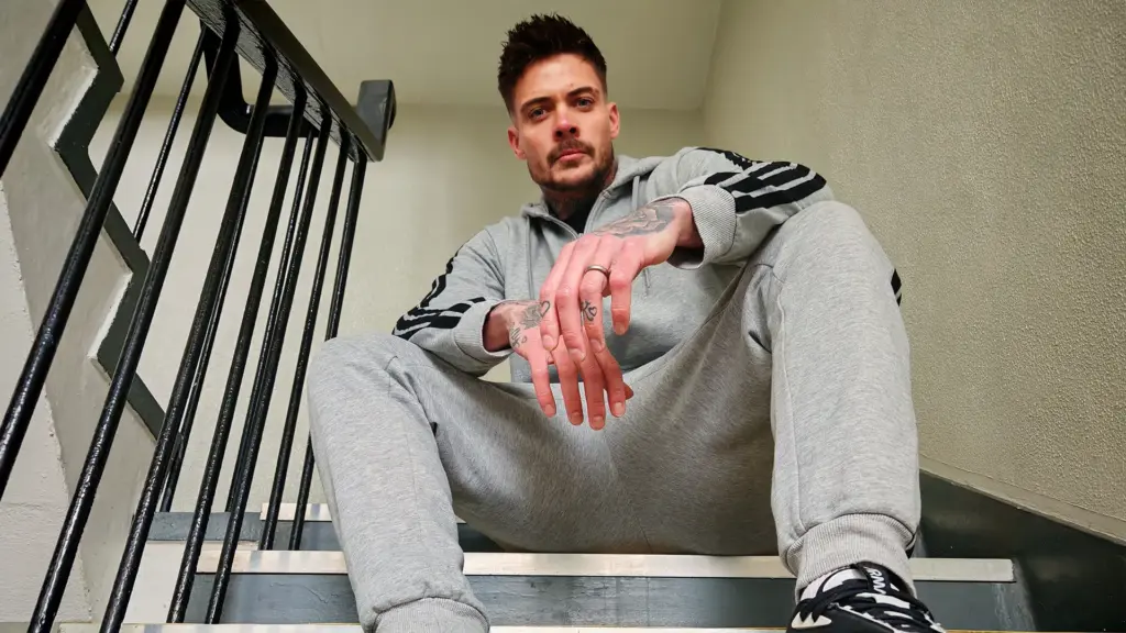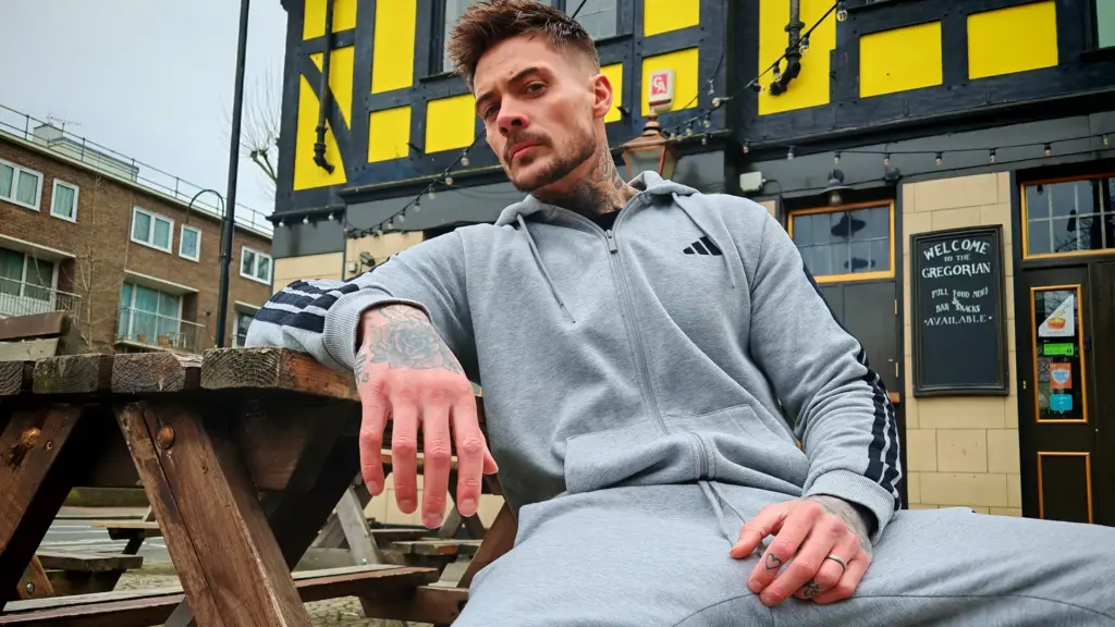 He stands loose, hoodie unzipped, letting the camera drink in every inch. Top comes off slow, revealing that carved, inked torso — veins popping across biceps, traps rising when he flexes. Trackies drop and out swings a thick, heavy uncut slab — meaty, veiny, hanging low and swelling fast as he grips it base to tip. Builder’s confidence, no nerves, just a low growl as he strokes deliberate and deep, hips rolling like he’s already owning your hole.
