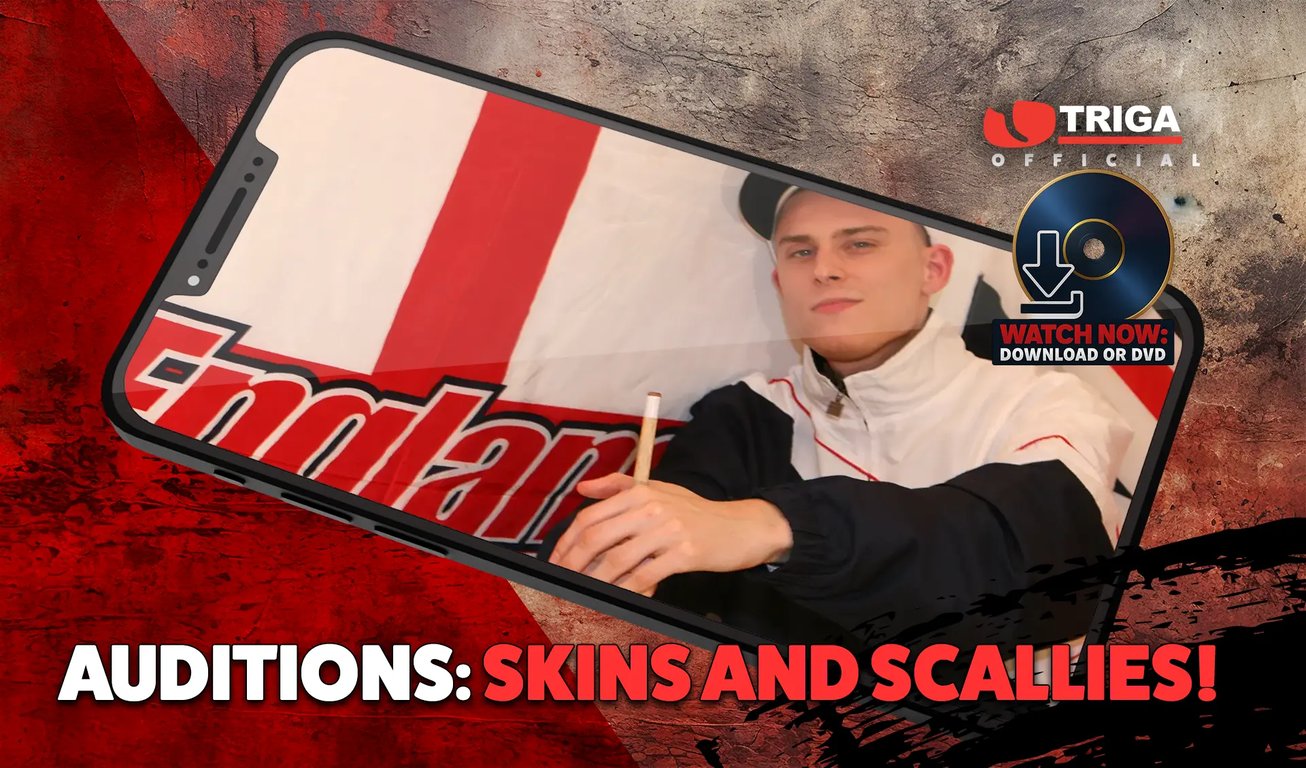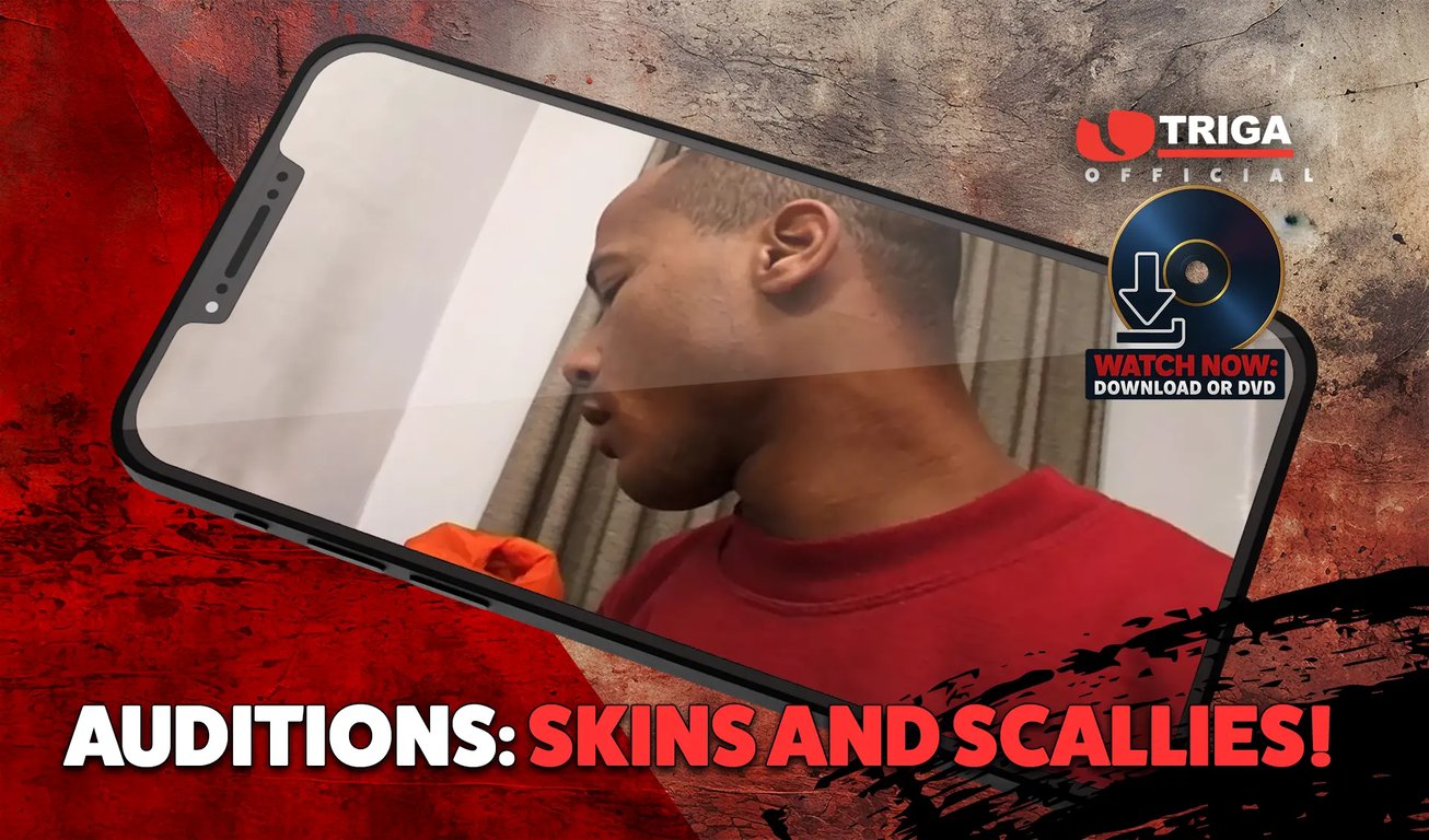 Auditions Skins and Scallies: You can’t beat a bit of Old Skool Bonehaed action can you?- there’s something about those Doc Marten’s, tight as fuck jeans, t shirts, braces and No 1 buzz cut : it’s the classic British hard man look and this Triga audition film is rammed with them – a dirty dozen Skin and Scally lads whopping out their hard cocks for the cameraman to prove they’ve got what it takes to be in the next Triga Bonehead fuckfest. Cocky, arrogant fuckers this bunch are, who can’t wait to show us what they’ve got and how much spunk they can shoot all over the studio. It’s a sight for sore eyes…so get yer clippers out, get your boots on and cum join the gang.