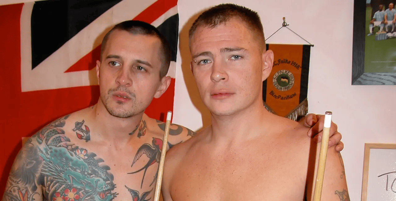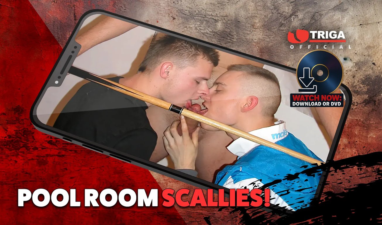 Ever fancied the geezer who’s stretched out over the pool table with his arse in the air to pot an awkward ball? Well, there’s loads of arse-cheek splitting shags in Triga’s Pool Room Scallies and plenty of ball banging action as ten scally lads shove their rock hard pool cue’s where the sun don’t shine and gag on some award-winning spunk shots! Down a shady back passage on the dark side of the Pool Room, where anythin’ goes round the back of the pool tables you’ll find these hard lads whopping out their cues and potting their balls in no time at all. This film has everything – hard fuckin’ duos, trios and four-way gangbangs. Rough and tough, there’s no holds barred in this movie. It all kicks off with a classic winner takes all duo of two tattooed studs rutting on the green baize like there’s no tomorrow! The four-way gang bang that follows is a real belter of a scene – it’s an 8 ball and four cock masterpiece of cock sucking arse banging where every pocket and every hole gets filled! Balls galore in this full-on Triga game! Get it now – it’ll be right up your alley lads