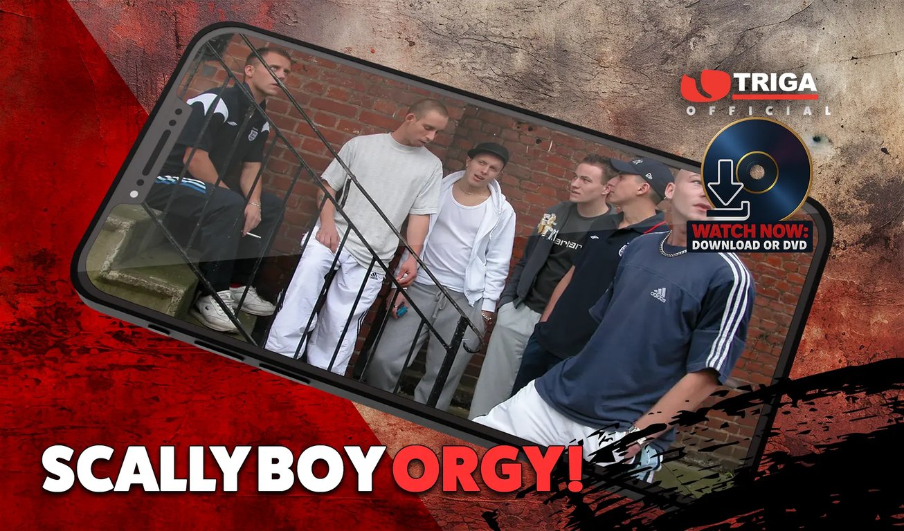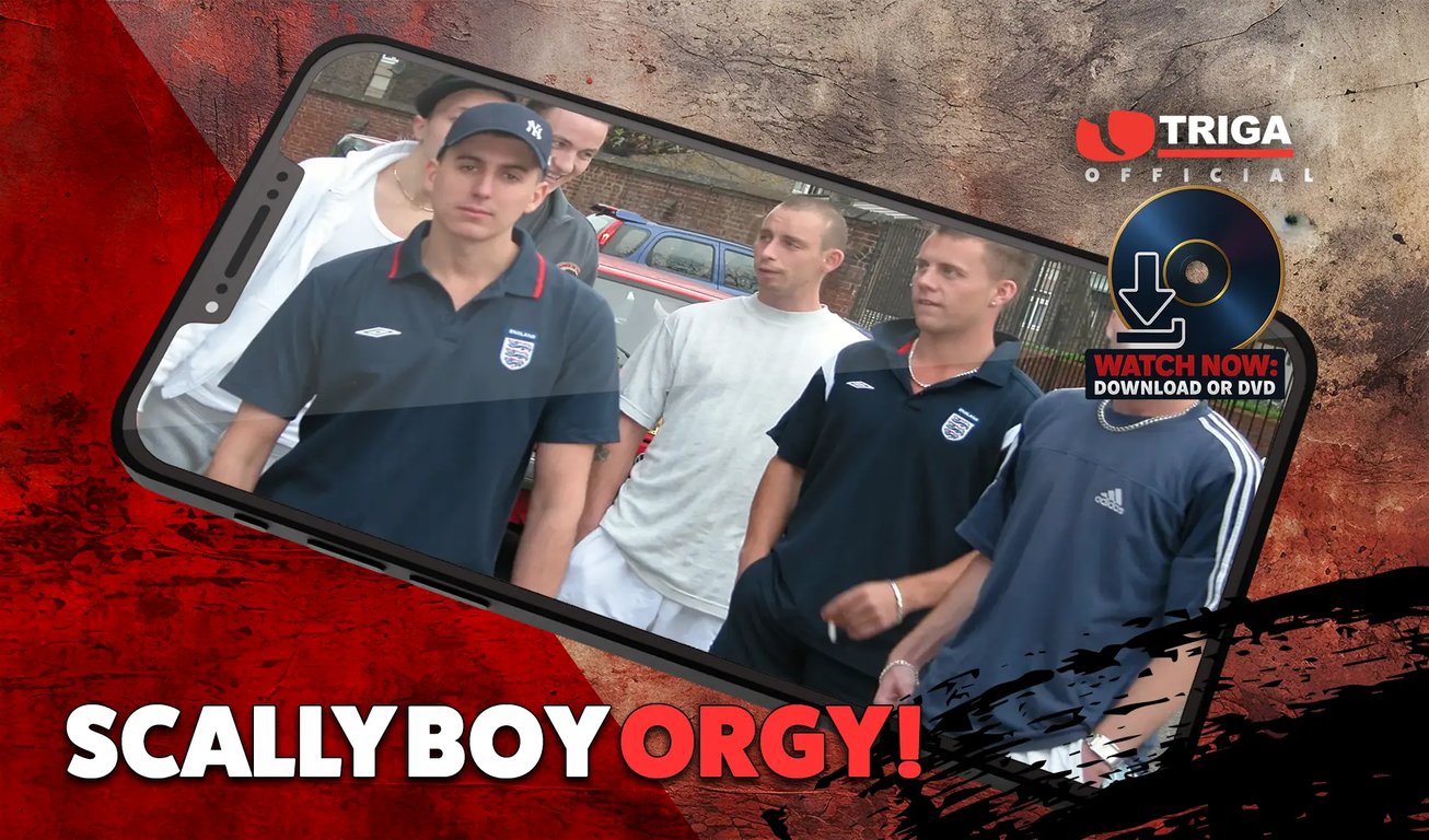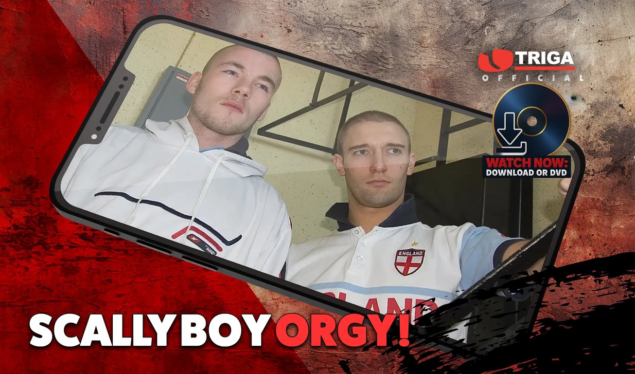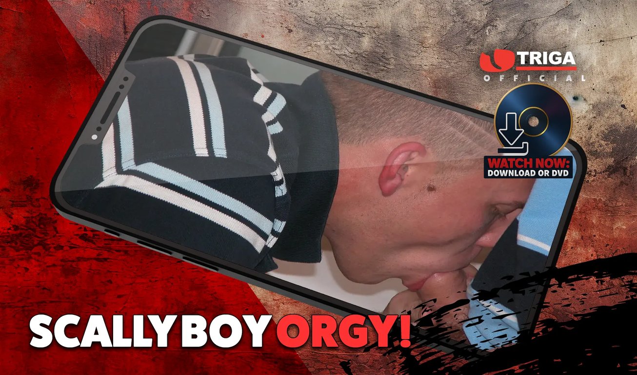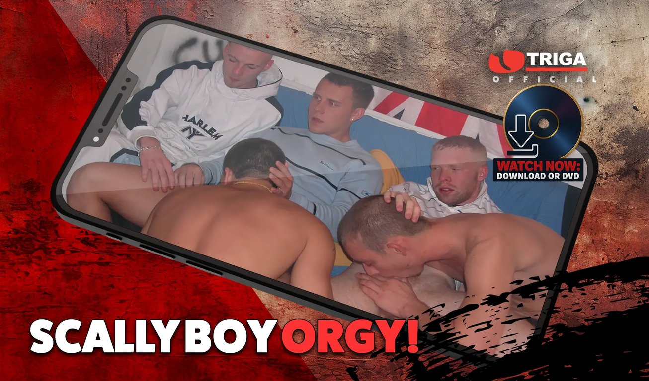 If you love your British Scallys rough, dodgy and fresh off the street corners of your local council estate, then Scally Boy Orgy will have you spunkin for months! This film follows their beloved theme of horny bisexual straight and gay lads in sportswear wanking & getting off but Triga’s `Scallyboy Orgy` sets a totally new standard for this most original of porn producers. The location is a tough London council estate; the set, a rented flat designed purely to fuck & crash in. Theres a time line running through this movie but trust me, it don’t matter if it’s morning or night to this lot. They just want to release some sexual tension; with and on each other. The opening scene is a 5-way. Three horny guys are sitting watching str8 porn when little stunner `Danny` arrives. Within minutes the lads have their knobs out, getting sucked by Danny and another mate who enters the fray. Ds trackies are peeled down & his hole gets probed for the first of many times. The original Scally Film.