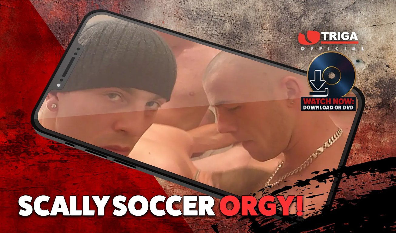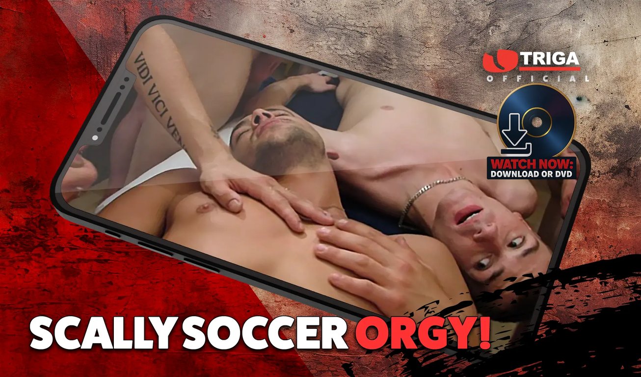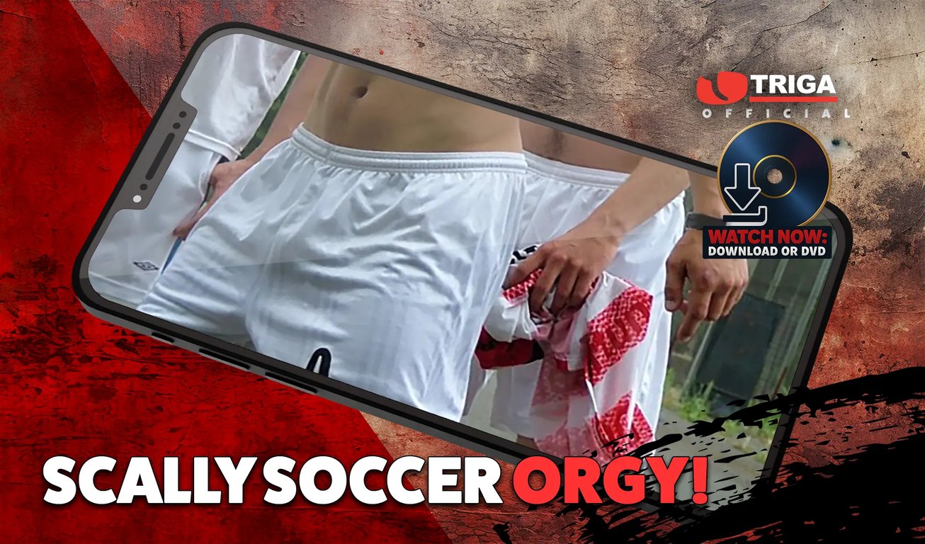 Scally Soccer Orgy: After a hot 5-A-side kick about, this group of mates heads off to the changing rooms to clean up. As usual, the lads are ready and as the banter starts the lads find their hands disappearing down their shorts and onto their growing cocks. Soccer shorts start to show signs of swelling knobs and soon the lads are taking off their sweaty footy shirts and stroking in front of each other, checking each other out, comparing cock size. As the room goes quiet the lads start to wank each other off, some go further and start sucking their mates’ cocks. Every lad needs to get off and they are all cool about helping each other out; it’s just lads together, ain’t it? It’s what mates do for each other. Muscle boys enjoy the attention of the leaner lads, but as long as they are all getting cock action, they don’t fuckin care whose mouth or hand is working their meat. Like a pack of dogs on heat, this horny team are up for just about anything! One of the best and hottest Footie team gang bangs available! You’ll be cumin’ long before full-time is called on this one trust me!Triga at its very best!