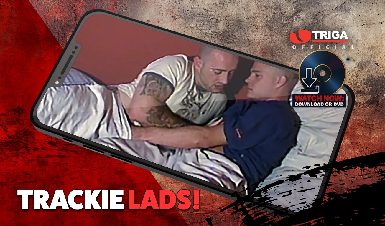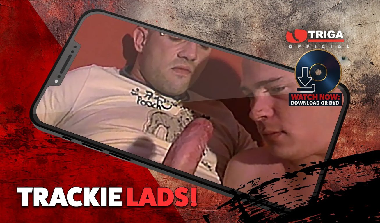 A bunch of scally lads spunk for you, solo and in pairs. You know the deal with Triga – working-class lads getting all rough and riotous in a very real way. Trackie Lads kicks off in a council flat with Warren. He’s big, butch, tattooed, shaven-headed and mean-looking and is wearing white trackie bottoms through which he’s massaging a big old log of a knob. He pulls the trackie bottoms off and we see his foreskin gliding back and forth over his dickhead with the spit glistening on it in close-up. Warren starts wanking with the discarded trackies until he spunks onto his hairy belly. Next up is a cute bloke, wanking through black trackies. When he de-kits, he’s got great abs and an edible penis, which he starts wanking until he shoots. The next guy is in an Yves Saint Laurent jumper and trackies. He’s about fit as, plus has a very long dick and naturally bushy pubes. Quality Triga.