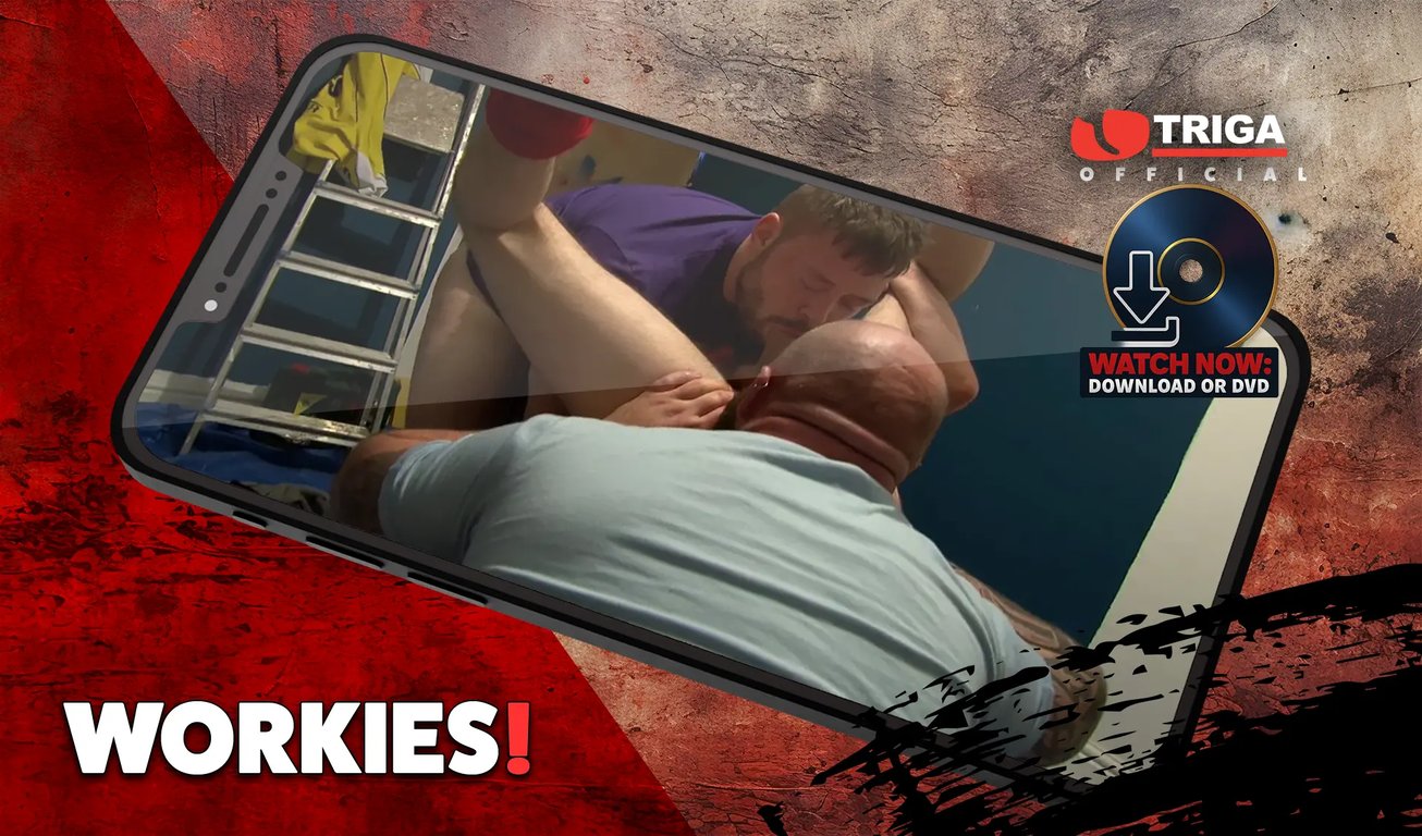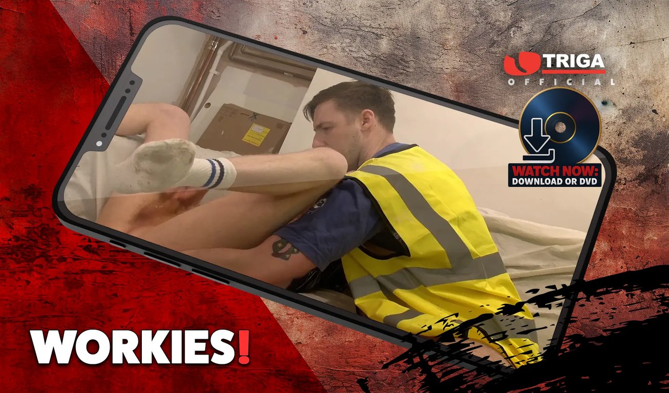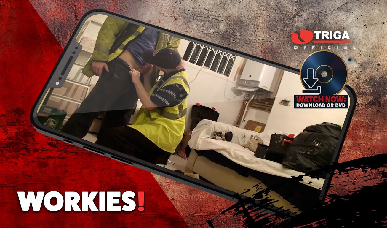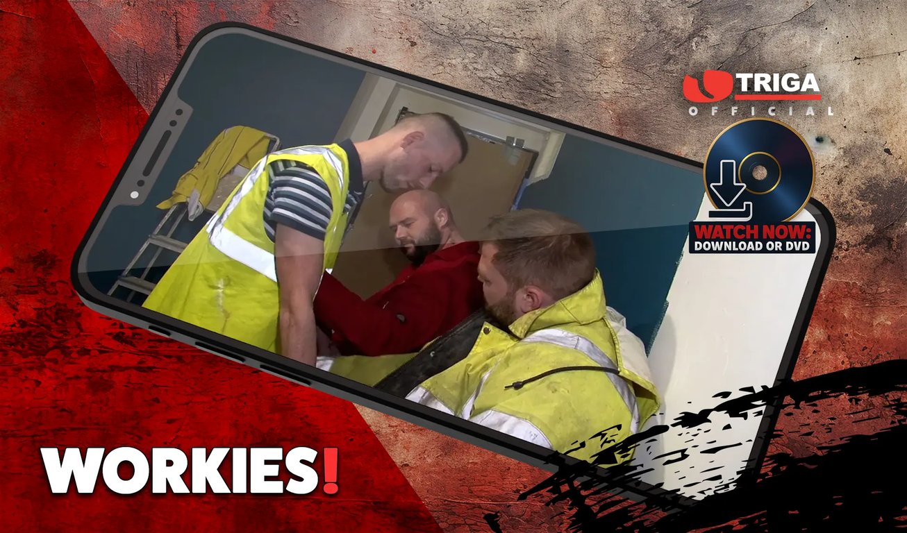 The filthy Workies are back down your street. Tarmacing your back passage and fillin’ your holes with their dirty great jack hammers! Mind you this lot of horny, sweaty, hod-carrying fuckers spend more time fuckin each other up the back passage than they do digging holes. A right gang of mucky men who ain’t afraid to get their hands dirty wether it’s erecting scaffolding poles, laying pipes or shovelling wet cement. So get your drills out lads, put on your hard helmets and get on site. It’s prick laying and hi-jiz jackets all the way with Triga’s new gang of filthy Workies!